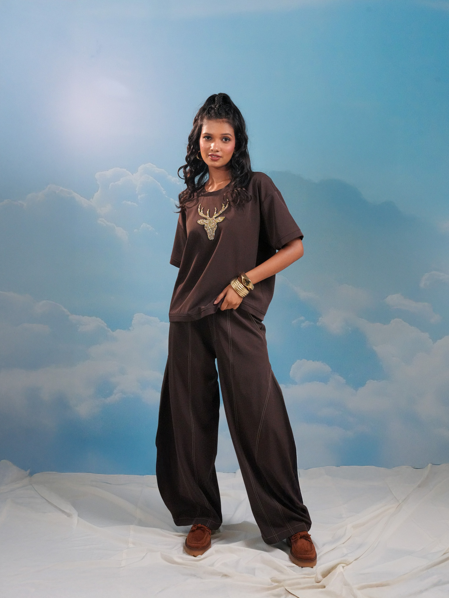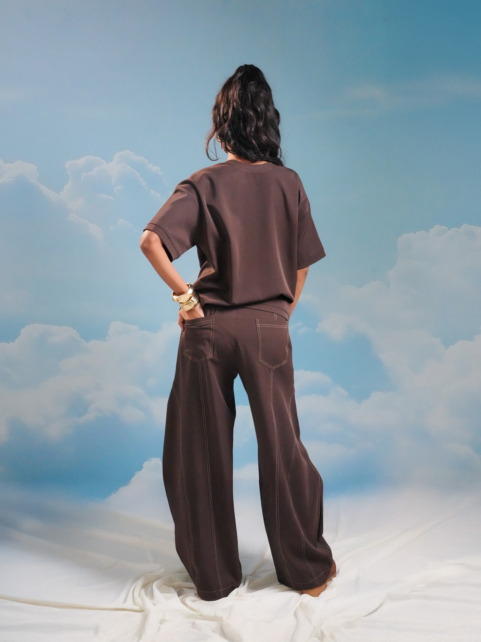 Brown barrel pants with stitch detailing, designed in a voluminous silhouette for a structured yet relaxed look.