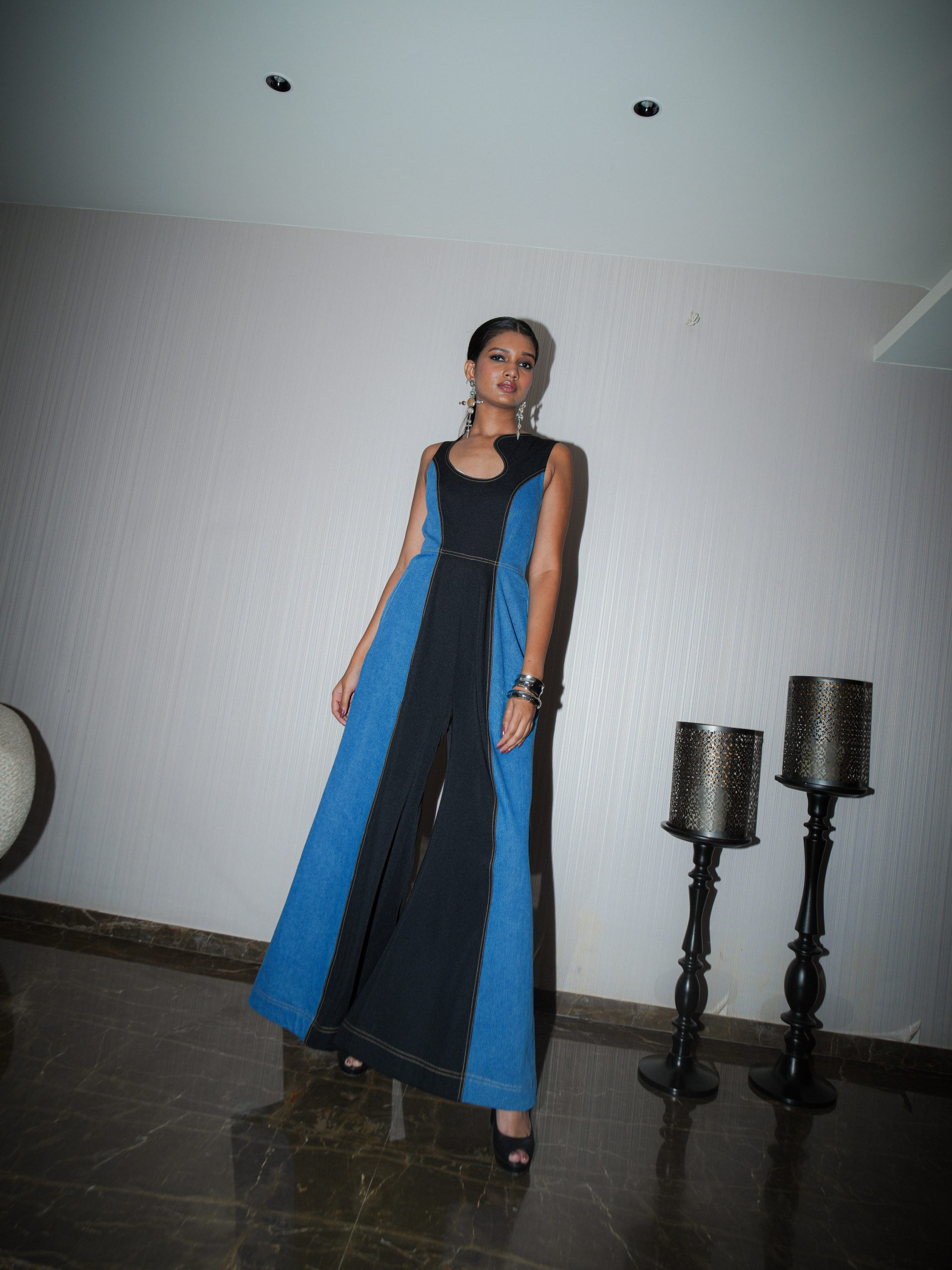 A bold colour block denim jumpsuit designed to make an confident statement with modern edge. The structured silhouette flatters the body while the contrast panels add visual impact. A standout piece that blends casual cool with elevated style.