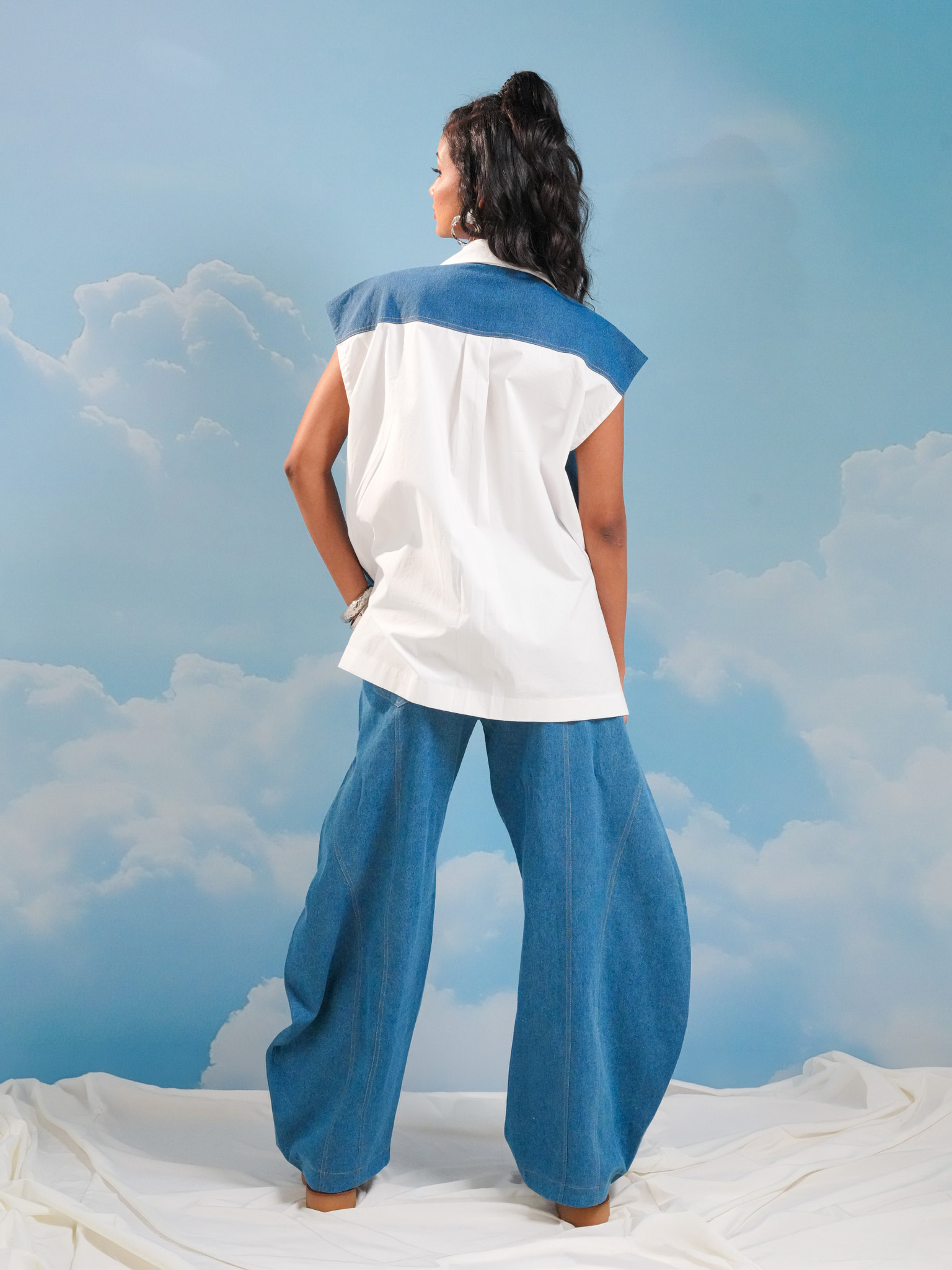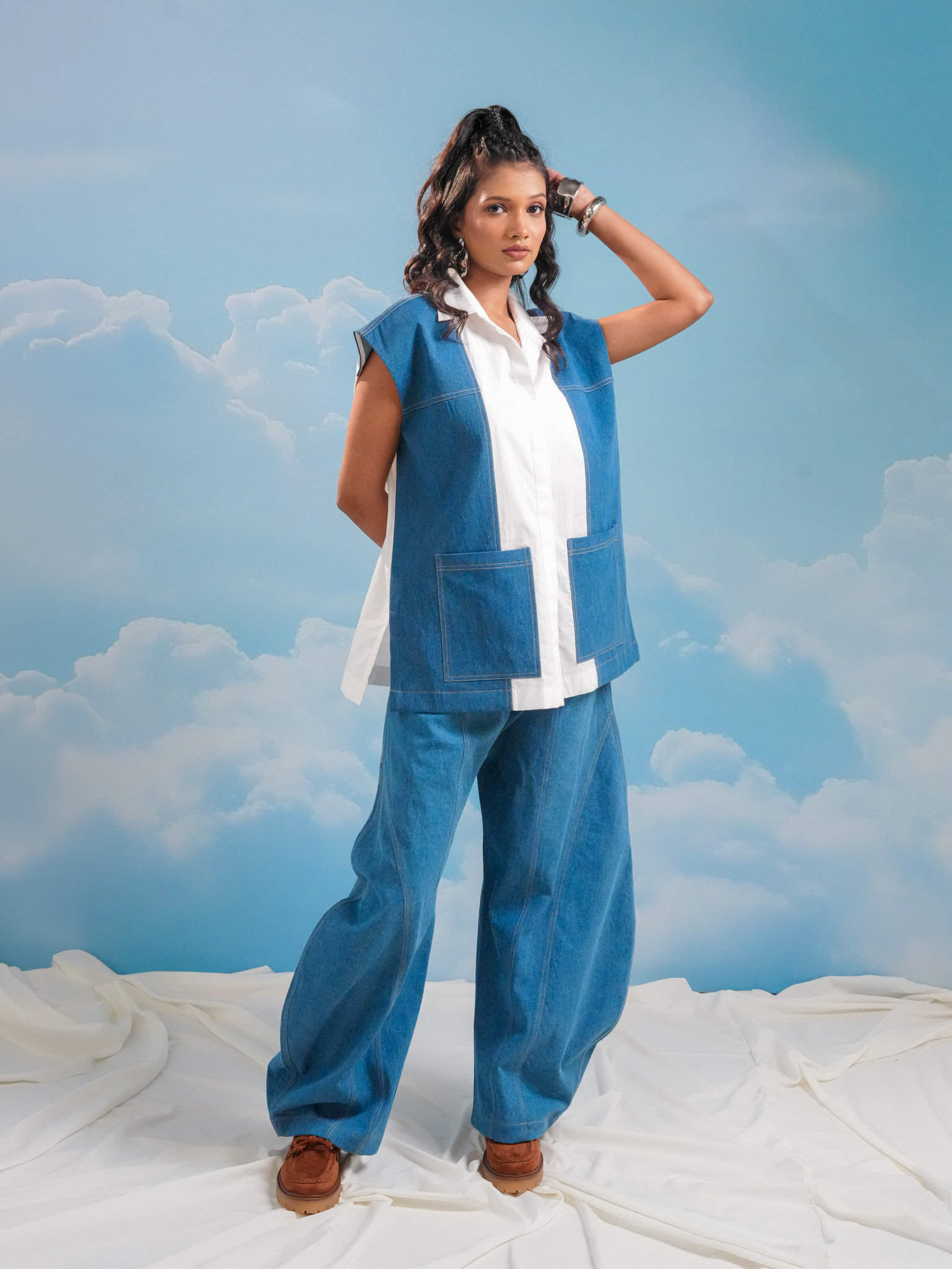 Effortlessly cool and versatile, this oversized shirt features a clean denim and white colour block design with large pockets.