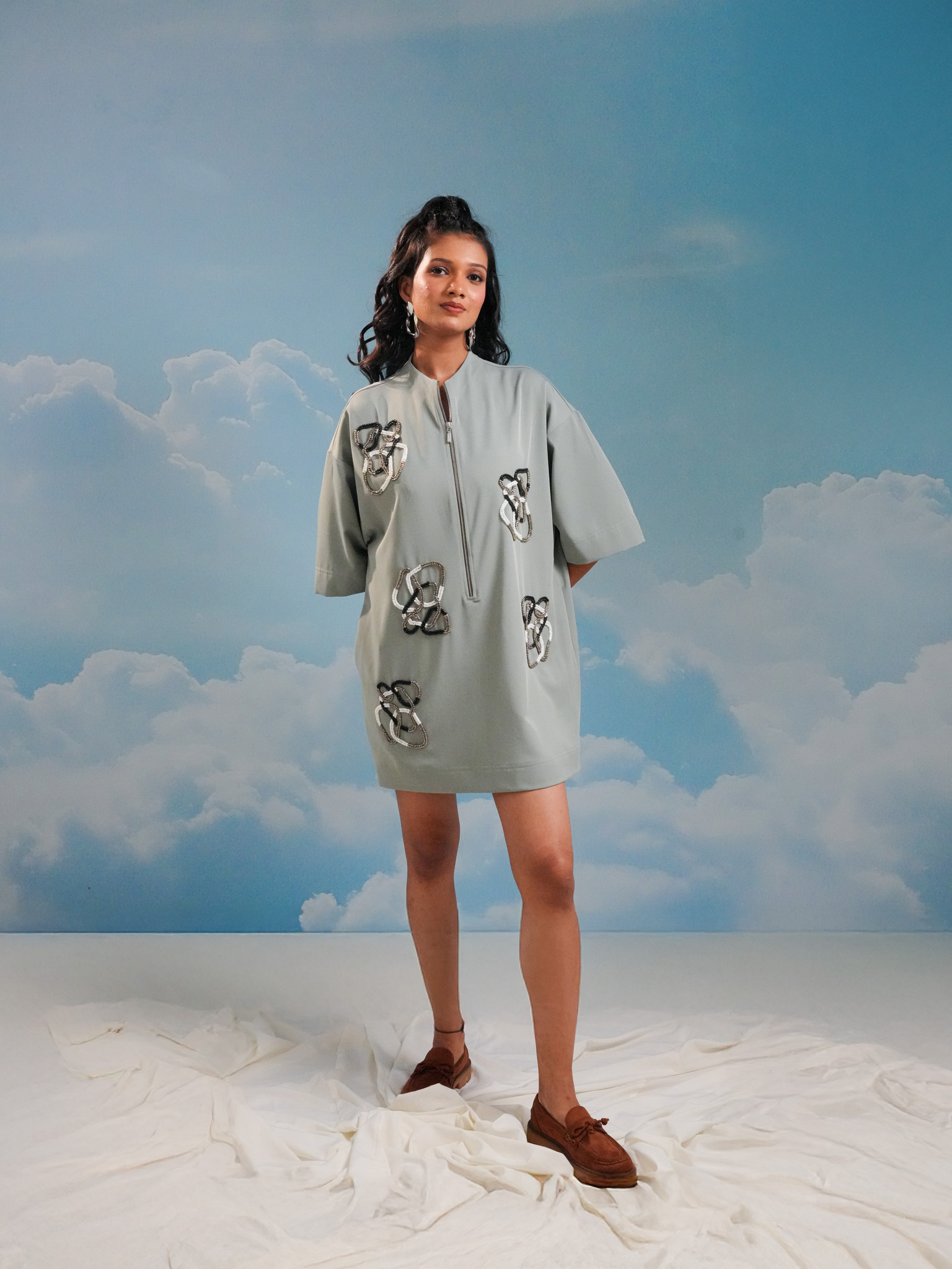Green t shirt dress featuring hand embroidered abstract motifs, designed with a front half zipper and pockets – effortlessly blending comfort with subtle elegance.