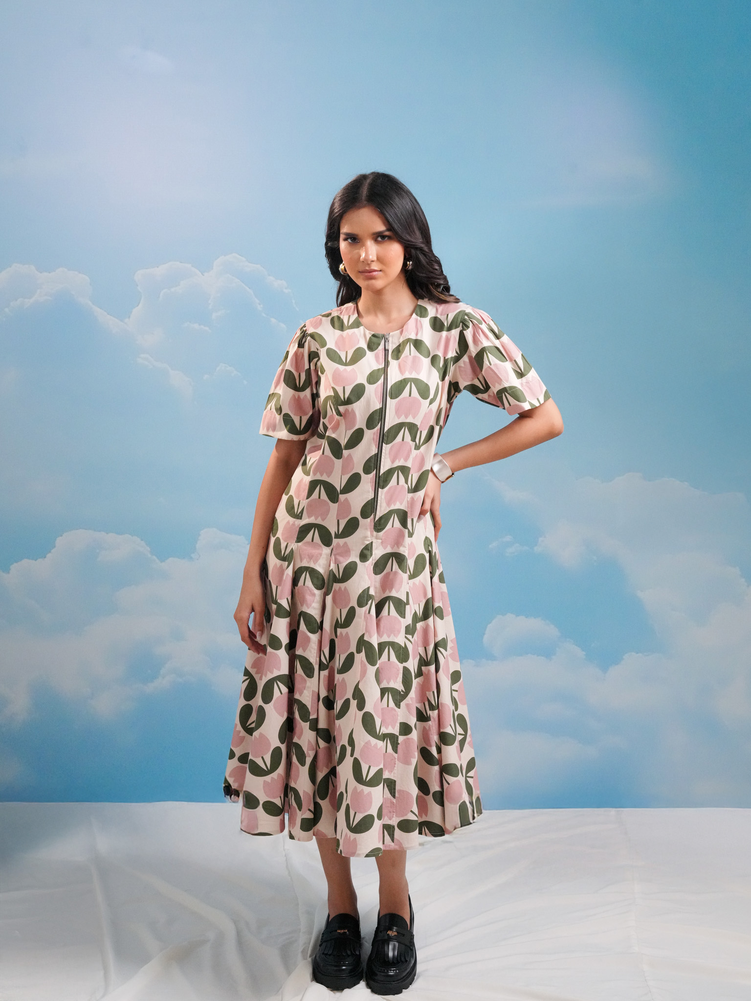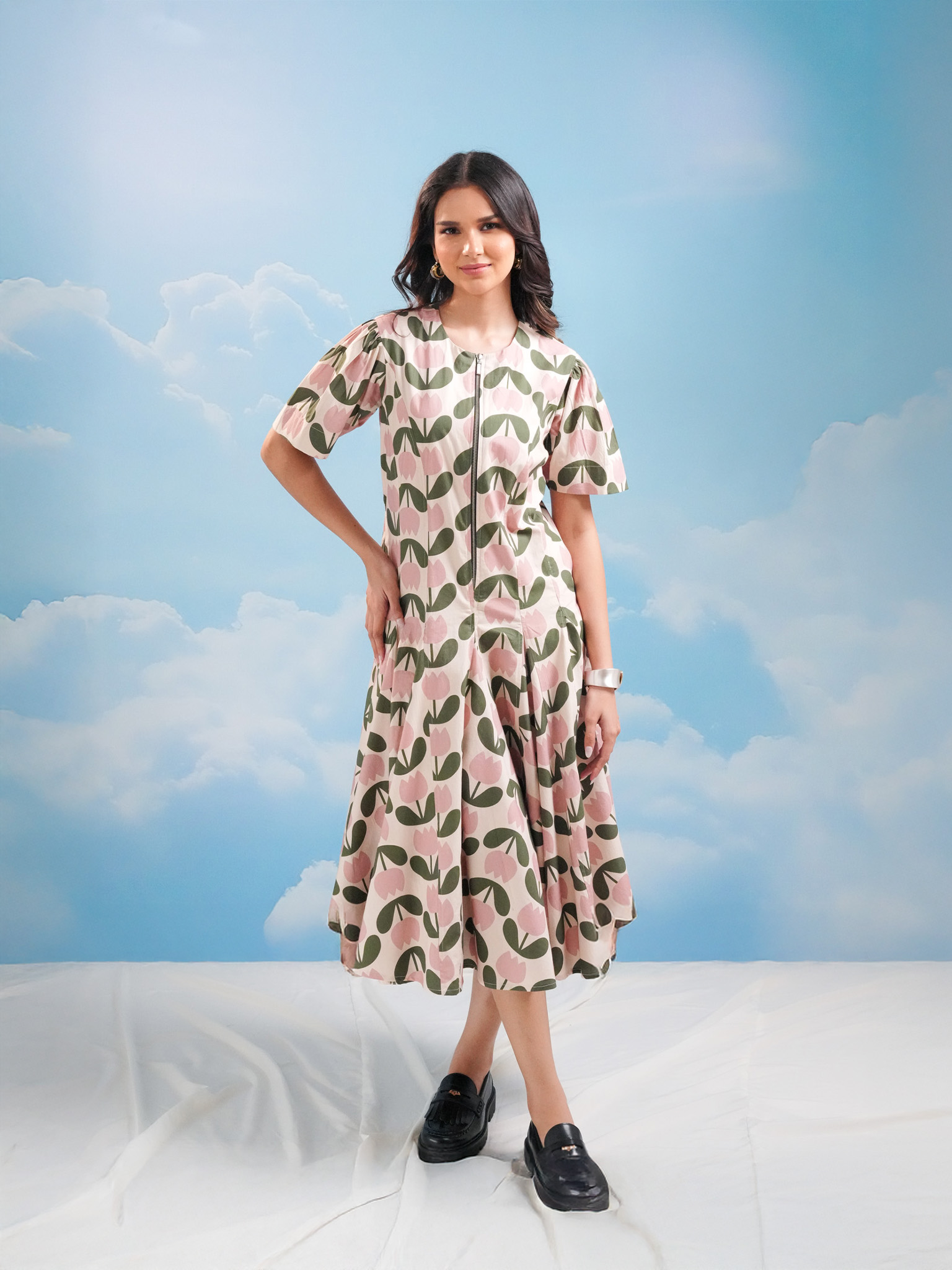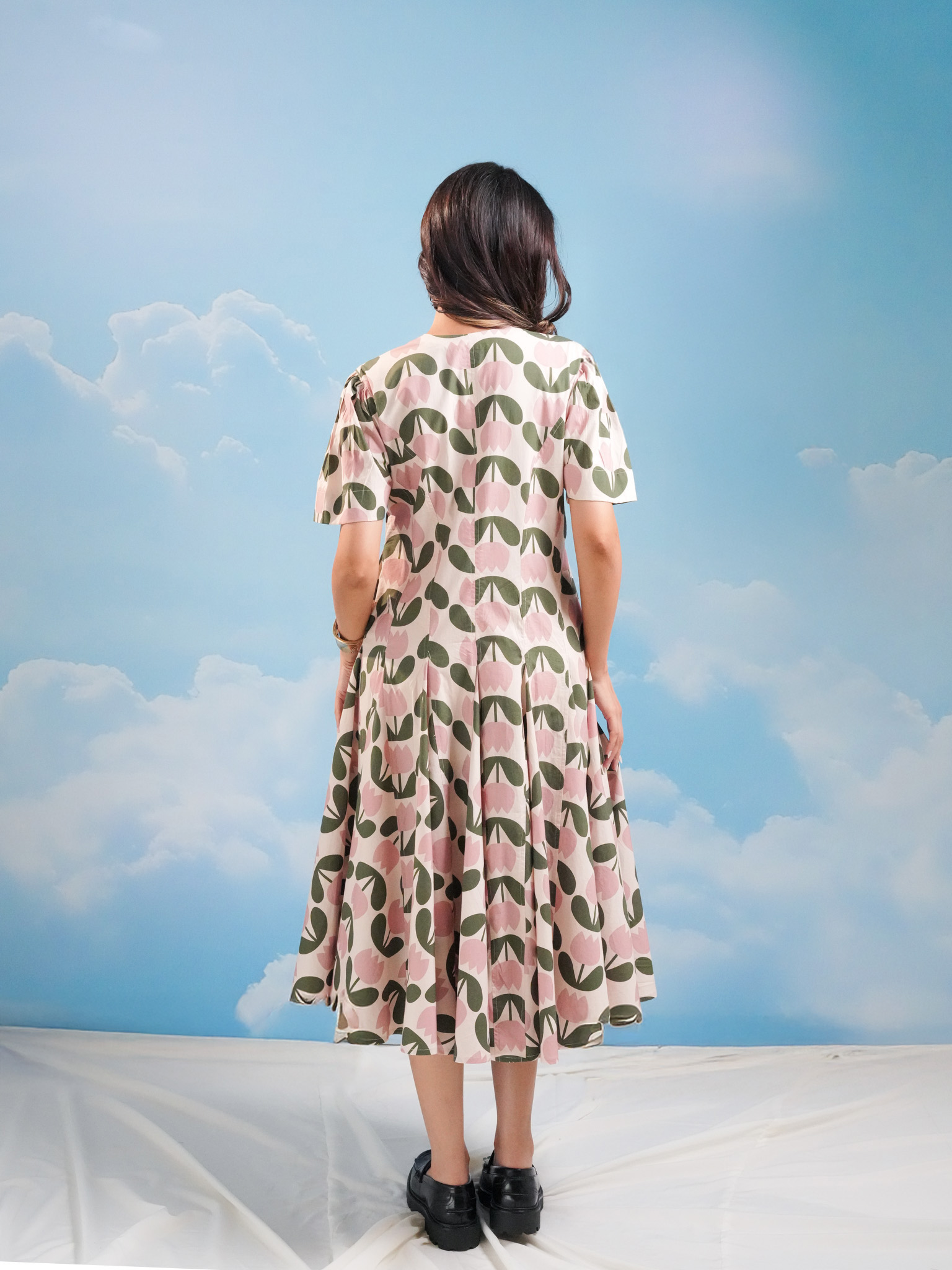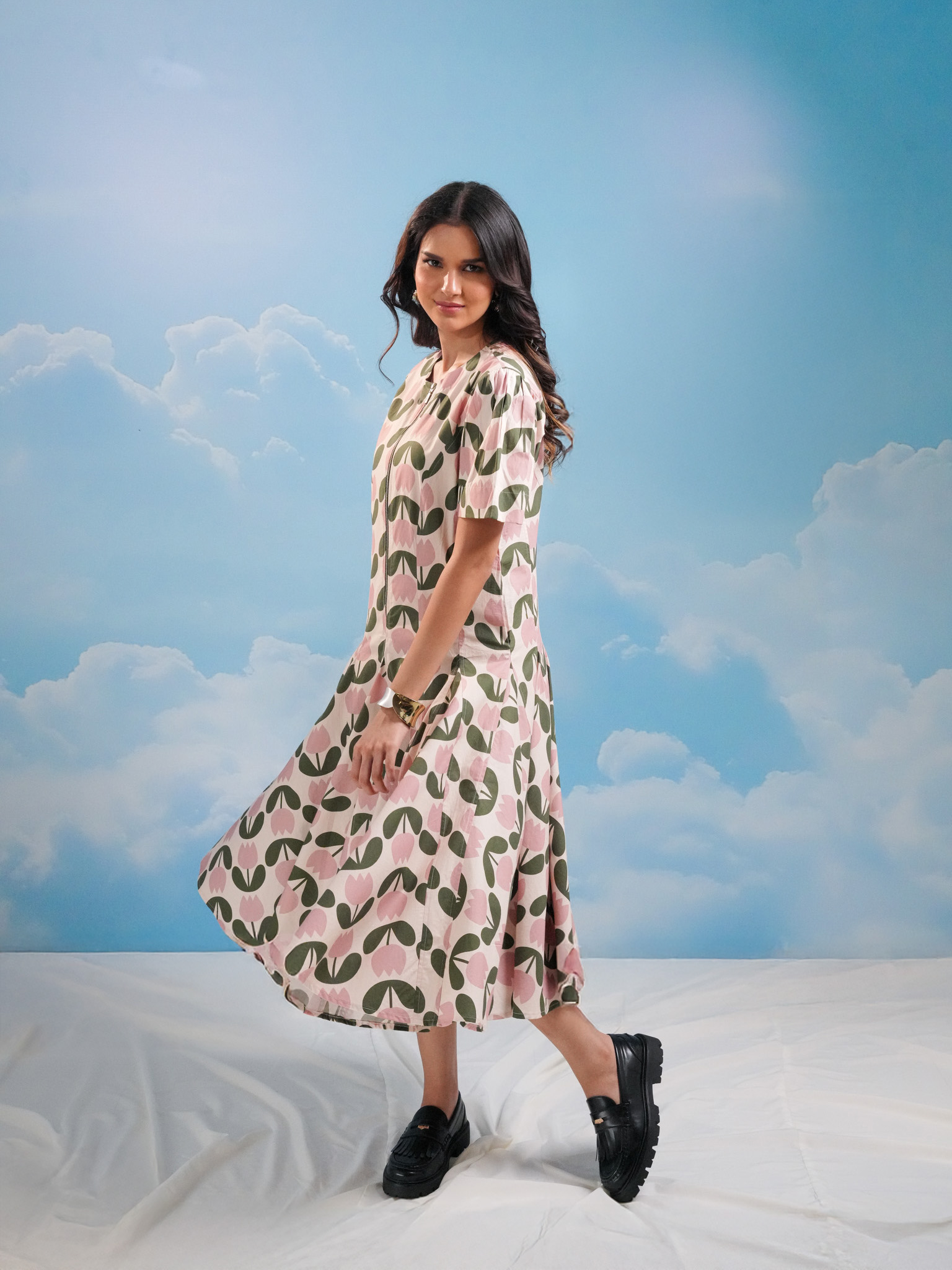 Effortlessly elegant midi dress with pockets in a soft, custom floral print, featuring a relaxed silhouette and gentle flare.